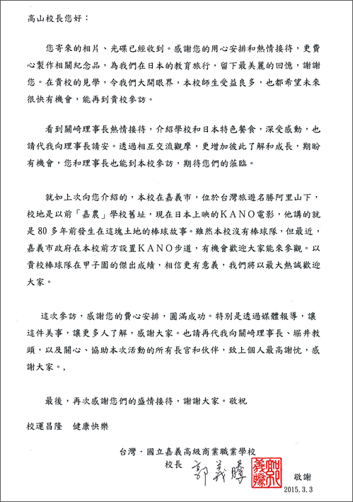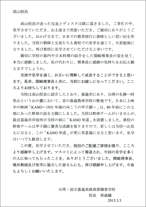 『台湾交流事業』において、国立嘉義高級商業職業学校からお礼状が届きました