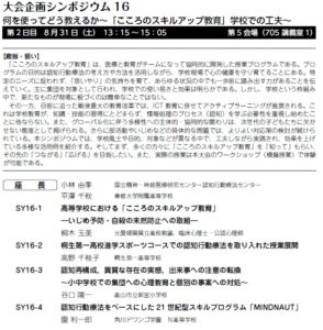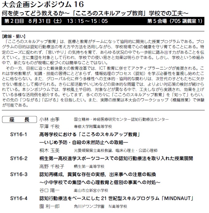 8月30日~9月1日に行われた第19回日本認知療法・認知行動療法学会 テーマ:人を結び、チームを育てる (国際医療福祉大学 東京赤坂キャンパス)において、8月31日(土)13:15~15:05大会企画シンポジウム16 何を使ってどう教えるか ~「こころのスキルアップ教育」学校での工夫 ~ に本校の養護教諭で健康衛生課長の高野が「桐生第一高校進学スポーツコースでの認知行動療法を取り入れた授業展開」というテーマで発表し、シンポジストとして登壇して来ました。