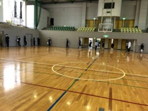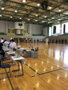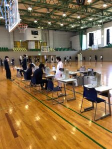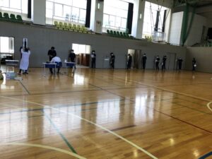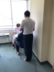 ソーシャルディスタンスを保ちながらの身体測定の様子です。