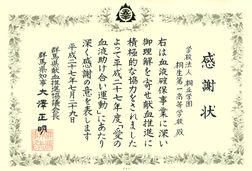 その功績を認められ、群馬県献血推進協議会長である群馬県知事 大澤正明様より感謝状を頂きました。