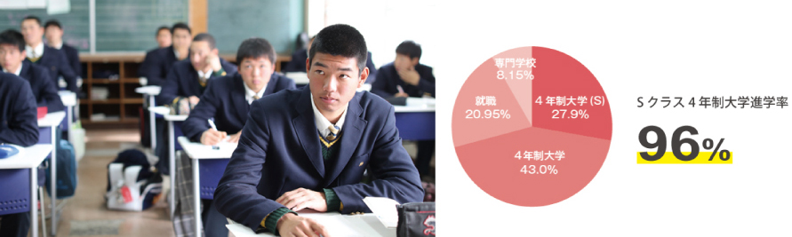 進学スポーツコースの中に特別選抜クラス 「S クラス」が設置されています。入学時の成績に基づいて選抜されるクラスです。強化指定クラブに所属しながら、国立大学、 難関私立大学合格を目指します。クラスの教科担当教員は生徒の希望を実現するために受験に対応した授業を展開します。