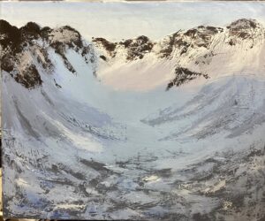 ペインティングナイフを使用し、雪山の山肌の表現を頑張りました。山の立体感や遠近感を意識しながら、描きました。