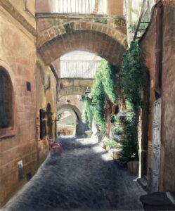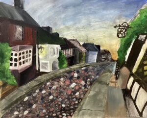 西洋の特徴的な建築がある街が好きなので、この風景を選びました。制作をしていて大変だったところは、空と陽の光が当たっている場所が1番明るいので、白を塗り重ねて明るく見せるようにしたところです。初めての油絵でしたが、乾きにくいという特徴を上手く使うなど、他の画材とはまた違った楽しさがあるなと感じました。