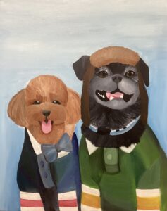 題材に私の愛犬を描きました。左の子がタイニー•プードルで、右の子がミックス犬です。私が愛犬を描こうと思った理由は、私が愛犬が大好きで、そんな2匹を絵にしたいと思い描きました。中学2年生の時にも愛犬の油絵を描いたことがあり、この数年間で絵のタッチの仕方が変わり画力が上がったんだと実感する事ができました。作品を描いていて大変だなと思った事は、愛犬の目です。特に右側の子の目が実際宇宙みたいな瞳をしているので表現するのが難しく大変だと感じました。けれど愛犬を描いていてここをもうちょっとこうしたいなとか、ここの毛の色工夫したいなと色々気づく事が多くて描いていてとても楽しかったです。