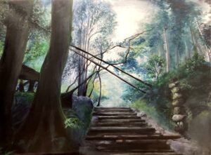 この題材を選んだ理由は、暗い森の中に光が差し込んでいる風景が幻想的で美しいと思ったからです。作品を制作する中で大変だったことは、生い茂る葉っぱと全体的な奥行きを表現することです。葉っぱの隙間を意識して、重なっているところが一色でのっぺりしないよう明暗をつけたのと、奥に行くほど青く薄くなっていくように絵の具を重ねて、遠目で見ても全体の奥行きを感じられる絵にしました。キャンバスに描き込んで少しずつ画面が鮮明になっていく過程はとても楽しかったです。