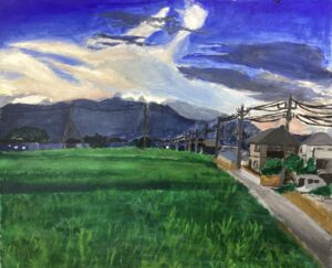 「風景」について書籍で調べた中で、一番綺麗だと目に留まった風景を描きました。油絵は臭いが独特で、乾くまでに時間かかり、必然的に絵の完成まで時間かかりました。街並みよりは、自然風景を描く方が良かったかなと後悔しました。しかし、普段ではできない良い経験になりました。