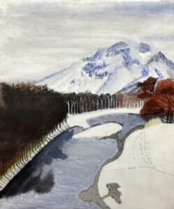 白色をメインとした絵が描きたかったので雪山を描きました。油絵を描いたのは、初めてだったけど面白かったです。雪山を描く時に大変だった事は、山のリアルさと川の色です。全体的に明るい色で塗ってしまうと雪があまり目立たなくなってしまうのであえて暗めの色にしました。